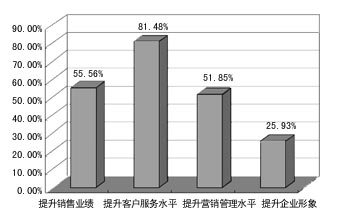 從結(jié)果上看,企業(yè)實(shí)施的最大動(dòng)力是“提升客戶服務(wù)水平”。這說(shuō)明,企業(yè)對(duì)CRM的理解還僅僅停留在初級(jí)階段,尚沒(méi)有充分認(rèn)識(shí)到對(duì)企業(yè)提升銷售業(yè)績(jī)、營(yíng)銷管理水平有著重要作用。這其實(shí)也反應(yīng)了我國(guó)企業(yè)目前的管理水平。
