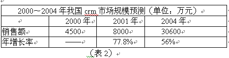 國內CRM市場經過一段時間的快速增長,2000年銷售額達到4500萬元左右。2001年市場情況將更好,預計銷售額將是上年的兩倍左右。CCID根據大量調查分析,對我國CRM市場規(guī)模作出如下預測: