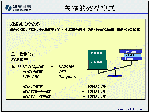 華夏證券經紀業(yè)務總部的姚磊作為唯一的成功應用案例代表,主要是和與會的金融機構分享在客戶關系管理規(guī)劃方面的一些成功經驗。華夏證券認為,對于證券公司的經紀業(yè)務來講,客戶關系管理的主要目標應該是把客戶關系管理系統(tǒng)的核心功能融入開戶、交易、服務、咨詢等四個與客戶互動的過程之中,比如:客戶資料規(guī)戶整合形成統(tǒng)一的客戶號,管理客戶交易偏好和產品偏好上的變化,配合多種渠道建立一對一銷售流程,客戶終身價值管理。在風險控制方面,華夏證券同樣貢獻了寶貴的經驗,在這方面他們認為最重要的方面是要做好高層領導的灌輸和培訓工作,讓企業(yè)的高層領導對于客戶關系管理有一個正確的理解,從而對于項目的投資有一個合理的預期和實證,通俗一點說,就是首先為整個項目找一個合適的發(fā)起人。第二點要注意,要有專業(yè)的項目管理隊伍,這其實就是集成商選擇方面的風險。除此之外,還要對項目要有一個明確的定義,關注每一步提交的結果,在項目過程中就隨時發(fā)現(xiàn)問題、解決問題。