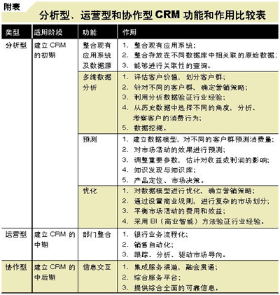 在上述目標(biāo)下,有什么類型的產(chǎn)品可供選擇呢?對(duì)銀行來說,有分析型、運(yùn)營型和協(xié)作型3類CRM,而這3類CRM也有著很大差別,對(duì)于有不同需求的銀行需要有不同的選擇。下面詳細(xì)分析這3類CRM。