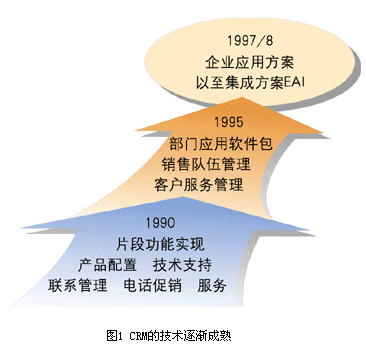 ----二是CRM的技術(shù)逐漸走向成熟(見圖1)。1990年左右,CRM方案只是片斷功能的實現(xiàn),到1995年以來、1997/8年以來,逐漸出現(xiàn)了部門級應(yīng)用軟件包、企業(yè)級應(yīng)用方案。有些企業(yè)甚至已經(jīng)開始關(guān)心自己原有的ERP系統(tǒng)與正在建設(shè)的CRM系統(tǒng)之間的集成問題。