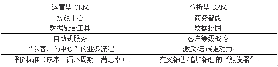一般情況下CRM的可分為兩大類:即運(yùn)營型CRM和分析型CRM。(有時把"協(xié)作型CRM"單獨(dú)作為一類)。多數(shù)情況之下運(yùn)營型CRM引用的是產(chǎn)品,服務(wù)和一個企業(yè)實(shí)際能夠"照料"客戶的運(yùn)做能力。關(guān)系中心,數(shù)據(jù)集合系統(tǒng)及Web站點(diǎn)僅僅是一些例子。分析型CRM主要指用來推動"以客戶為中心"的戰(zhàn)略和工具。商務(wù)智能系統(tǒng),數(shù)據(jù)挖掘工具及客戶層級戰(zhàn)略都可以算在這個范疇之內(nèi)。