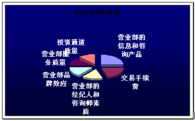 。。具筆者調查,現(xiàn)在對營業(yè)部盈利最大的是機構客戶或者大額個人投資者,而隨著股市行情的低彌,他們在選取營業(yè)部的考慮因素主要關鍵點及其所占比例如下圖: