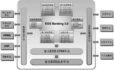 普元公司順應中國銀行業(yè)發(fā)展的趨勢,綜合國內(nèi)外金融業(yè)的市場營銷和管理模型,把具有世界級水平的EOS平臺推廣到銀行業(yè),提供具有中國特色的“EOS銀行客戶經(jīng)理管理系統(tǒng)”。這套系統(tǒng)可以幫助銀行快速組織資源,面向客戶提升客戶服務、市場營銷水平,同時對客戶經(jīng)理的業(yè)績考核加強管理,為客戶經(jīng)理提供風險控制工具,為營銷主管部門決策提供支持。最終實現(xiàn)幫助銀行達到提高利潤、降低成本,提高銀行客戶滿意度及提高市場占有率的管理目標。