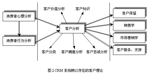 大多數(shù)CRM研究人員和應(yīng)用專家不認(rèn)為CRM存在作為應(yīng)用支撐的理論基礎(chǔ),充其量認(rèn)為CRM只是支持企業(yè)營(yíng)銷的商業(yè)策略。隨著企業(yè)追求市場(chǎng)活動(dòng)績(jī)效的熱情的提高,企業(yè)開(kāi)始采用定性和定量的分析方法決策其與市場(chǎng)和客戶有關(guān)的企業(yè)活動(dòng),如有效的客戶滿意度評(píng)價(jià)、客戶分類、客戶盈利率分析等。而這些決策迫切需要相關(guān)的理論基礎(chǔ)為指導(dǎo),真正擺脫靠經(jīng)驗(yàn)進(jìn)行決策的做法。當(dāng)前CRM的理論研究和學(xué)術(shù)探討并未真正走向體系化、統(tǒng)一化,所以造成CRM市場(chǎng)中提供的功能參差不齊。CRM系統(tǒng)必須存在一個(gè)完整的理論體系為指導(dǎo),本文將CRM系統(tǒng)賴以存在的理論基礎(chǔ)統(tǒng)稱為客戶理論(Theory on Customer)。