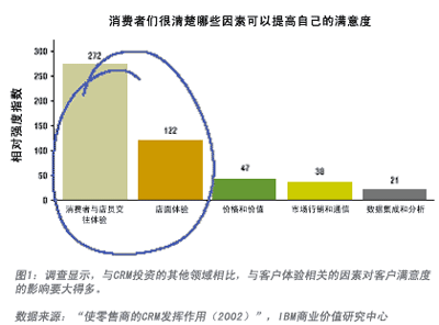 IBM商業(yè)價(jià)值研究中心的一項(xiàng)研究結(jié)果印證了筆者的設(shè)想。IBM 對(duì)美國(guó)10家零售商的消費(fèi)群進(jìn)行了調(diào)查,其中包括5家表現(xiàn)較好的(過(guò)去3年中在店面單位面積銷(xiāo)售和凈收入的增長(zhǎng)方面做得很好)和5家表現(xiàn)較差的(業(yè)績(jī)持平或出現(xiàn)下滑)。調(diào)查發(fā)現(xiàn),領(lǐng)先的零售商能夠同時(shí)有效使用關(guān)鍵的滿意度推動(dòng)因素和關(guān)系要素,為消費(fèi)者提供最佳的“總體體驗(yàn)”,即一家公司(或一個(gè)品牌)有形、無(wú)形地給客戶留下的總體印象。該項(xiàng)調(diào)查的統(tǒng)計(jì)分析結(jié)果發(fā)現(xiàn)了5組滿意度推動(dòng)因素: