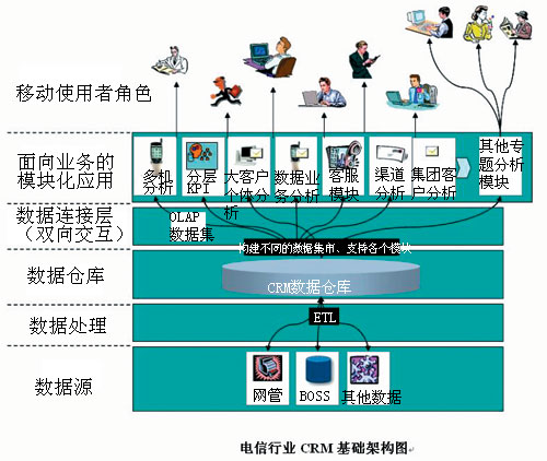 電信行業(yè)早期的CRM系統(tǒng)主要是由單一的多維分析子系統(tǒng)組成,比如移動總公司最早的CRM系統(tǒng)就僅僅規(guī)范了以多維分析為標(biāo)準的九大主題分析。隨著移動電信市場的迅速增長,復(fù)雜程度越來越高,更多的子系統(tǒng)被添加進來,IT系統(tǒng)建設(shè)中模塊化的思路通過數(shù)據(jù)集市的方式在CRM建設(shè)中體現(xiàn)明顯。