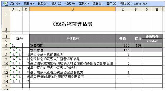 根據(jù)評(píng)估分?jǐn)?shù)值形成CMM評(píng)估表,為電子表格形式,帶有指標(biāo)編號(hào)和權(quán)重、分值,后面為實(shí)際評(píng)測(cè)分?jǐn)?shù)和備注,可以作為單獨(dú)的廠商系統(tǒng)評(píng)測(cè),也可以作為橫向的多家廠商系統(tǒng)的水平評(píng)測(cè)。當(dāng)橫向的多家系統(tǒng)商評(píng)測(cè)時(shí)實(shí)際評(píng)測(cè)分?jǐn)?shù)欄為多家系統(tǒng)商評(píng)測(cè)分?jǐn)?shù)。