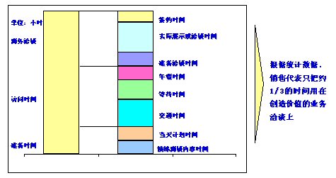 銷售資源是有限的,如何合理分配資源并確保最大的客戶機(jī)會(huì)和客戶價(jià)值是一個(gè)關(guān)鍵的問題。對(duì)于銷售代表,個(gè)人的時(shí)間是寶貴的資源。根據(jù)統(tǒng)計(jì)數(shù)據(jù),銷售人員只把約1/3的時(shí)間用于增值的業(yè)務(wù)洽談上,這意味著在銷售人員的時(shí)間管理上有很大的提升空間。如圖3-1所示。