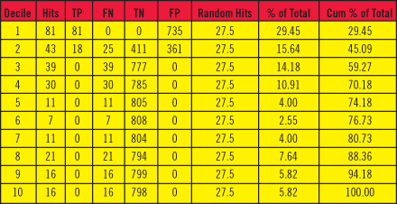 Decile-分組序號;Hits-命中數(shù),即每組內(nèi)包含的實(shí)際響應(yīng)數(shù),等于TP+FN;