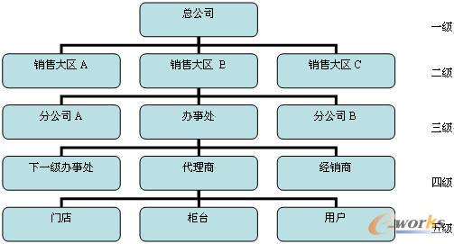 目前國內(nèi)企業(yè)分銷網(wǎng)絡層次最多可達到五層,如圖1所示。最上層是營銷總部,第二層是銷售大區(qū),第三層是各地分公司、辦事處,第四層是各地辦事處、代理商和經(jīng)銷商,第五層是用戶或門店。