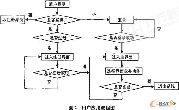 當(dāng)用戶與系統(tǒng)聯(lián)系時(shí),首先確定是否為注冊(cè)用戶,如果是注冊(cè)用戶,就可以通過(guò)客戶編碼和密碼登錄系統(tǒng),進(jìn)行業(yè)務(wù)的操作。否則,尋問(wèn)用戶是否需要注冊(cè),如果客戶拒絕注冊(cè),則可以進(jìn)入一般功能界面,如公司新聞、各項(xiàng)政策等。如果客戶同意注冊(cè)并且注冊(cè)成功,那么就可以進(jìn)入系統(tǒng)業(yè)務(wù)操作流程。然后用戶搬據(jù)自身的需求,對(duì)系統(tǒng)的具體功能模塊進(jìn)行操作,以達(dá)到與企業(yè)數(shù)據(jù)庫(kù)交互目的,從而實(shí)現(xiàn)業(yè)務(wù)操作的及時(shí)性和移動(dòng)性。具體如圖2所示。