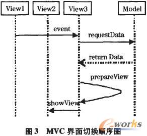 在界面設(shè)計(jì)上,使用MVC模式。MVC模式包括三類對(duì)象,模型Model是應(yīng)媚對(duì)象,視圖View是它在屏幕上的表示,控制器定義了用戶輸入的響應(yīng)方式。MVC架構(gòu)使表現(xiàn)與邏輯分開(kāi),使得多個(gè)視圖可以共用同一個(gè)MVC模型。MVC界面切換順序圖如圖3。