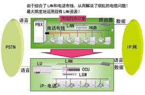 對(duì)于全部采用IP PBX的企業(yè),在完成數(shù)據(jù)網(wǎng)布線的同時(shí),也等于完成了電話網(wǎng)的布線,可大大節(jié)省布線成本,從而解決了繁雜的電纜問題(圖一)。