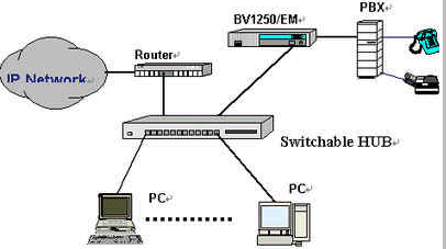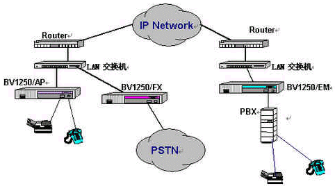 OKI公司的IVG BV1250互聯(lián)網(wǎng)絡(luò)IP電話語音網(wǎng)關(guān)就是一種非常好的選擇,完全基于H.323 Ver2.0協(xié)議,實現(xiàn)語音和傳真在因特網(wǎng)上傳輸。使用BV1250 進(jìn)行IP電話和IP FAX通信時,可以感覺到與傳統(tǒng)的電話或傳真所提供的服務(wù)毫無區(qū)別。運(yùn)用BV1250,可通過互聯(lián)網(wǎng)(Internet/Intranet)將電話機(jī)、傳真機(jī)和PBX進(jìn)行互連,建立專用的IP電話網(wǎng)絡(luò)。BV1250使用的是靜態(tài)IP地址,因此不能將BV1250連接到使用DHCP(動態(tài)主機(jī)通信規(guī)程)的互聯(lián)網(wǎng)上。常用連接方式如下圖所示: