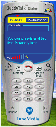。ㄈ鐖D3),這個(gè)就是BuddyTalk的軟件界面。這象不象一個(gè)手機(jī)?上面的藍(lán)色部分是液晶屏。你可以選擇pc-to-pc或者pc-to-phone,下面是用來輸入電話號碼的一個(gè)空框,空框下面的部分是軟件顯示提示信息的,再下面是音量大小的顯示器。液晶屏的下面部分跟手機(jī)幾乎一樣,其中一個(gè)“search”,這是用來上網(wǎng)實(shí)現(xiàn)全球用戶數(shù)據(jù)庫搜索,一個(gè)“options”,各種設(shè)置可以在這里完成,“Memory”記錄的是你通話信息,以利快速撥號。