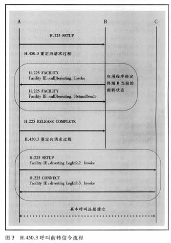圖3顯示了可編程呼叫前轉的信令流程,在終端B的控制下通過把呼叫重新定向到一個新的目的地址而實現(xiàn)呼叫前轉。終端B在接收到SETUP消息后,發(fā)送一個包含前轉目的終端C地址的信令消息到呼叫發(fā)起終端A。然后終端A直接建立到終端C的連接,同時向終端C指明該業(yè)務的性質和相應信息。