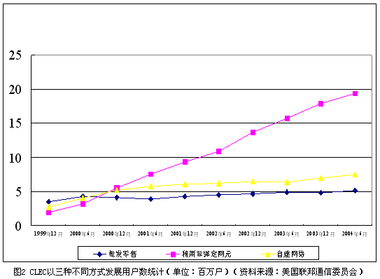 從經(jīng)營(yíng)模式上看,本地非主導(dǎo)運(yùn)營(yíng)商的商業(yè)模式在過去的5年中發(fā)生了很大變化。在市場(chǎng)剛剛開始引入競(jìng)爭(zhēng)的1999年,42.9%的本地非主導(dǎo)運(yùn)營(yíng)商選擇了批發(fā)零售這種進(jìn)入門檻相對(duì)較低的商業(yè)模式,本地電話市場(chǎng)一度活躍著大量地區(qū)性的小運(yùn)營(yíng)商。由于面臨本地主導(dǎo)運(yùn)營(yíng)商的強(qiáng)烈抵制,非綁定網(wǎng)元政策的實(shí)施自公布以來(lái)一再推遲,經(jīng)過反復(fù)的法律訴訟,美國(guó)最高法院在2002年最終裁定非綁定網(wǎng)元政策合法。自那時(shí)起,AT&T、MCI等全國(guó)性的長(zhǎng)途電話運(yùn)營(yíng)商紛紛通過租用非綁定網(wǎng)元的方式進(jìn)入本地電話市場(chǎng)。截止到2004年6月,本地主導(dǎo)運(yùn)營(yíng)商已經(jīng)提供了約2150萬(wàn)線非綁定本地用戶線給本地非主導(dǎo)運(yùn)營(yíng)商。CLEC以三種方式發(fā)展用戶的情況如圖2所示。