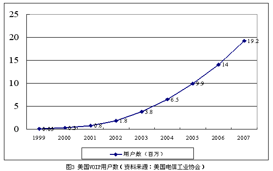 與此同時(shí),Qwest也開始在明尼蘇達(dá)州提供類似的VoIP業(yè)務(wù),并計(jì)劃在近期內(nèi)推向全國(guó)。Verizon與北電網(wǎng)絡(luò)簽訂了大筆的訂單,計(jì)劃全面改造其本地電話網(wǎng)絡(luò)提供的VoIP業(yè)務(wù)。一些曾經(jīng)著名的網(wǎng)絡(luò)電話公司(如Net2Phone)也開始進(jìn)入傳統(tǒng)電話市場(chǎng)。截止到2004年2月底,Vonage的全I(xiàn)P網(wǎng)絡(luò)已經(jīng)擁有13萬(wàn)VoIP用戶。據(jù)美國(guó)電信工業(yè)協(xié)會(huì)預(yù)測(cè),到2007年年末,全美的VoIP用戶將會(huì)達(dá)到1920萬(wàn)戶,如圖3所示。