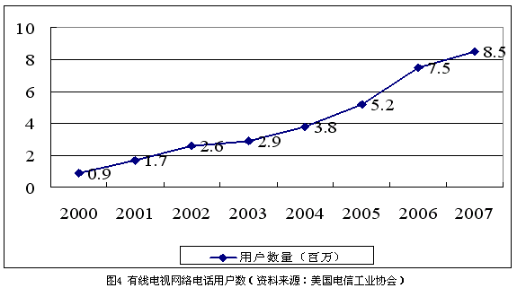 隨著有線電視用戶數(shù)量逐漸達(dá)到飽和,有線電視公司也在積極尋找新的利潤(rùn)增長(zhǎng)點(diǎn)。在過去的7年中,有線電視公司投入了高達(dá)800億美元的資金用于網(wǎng)絡(luò)升級(jí)改造,現(xiàn)在,大部分有線電視網(wǎng)絡(luò)已經(jīng)可以提供包括寬帶接入、本地和長(zhǎng)途電話、數(shù)字電視、視頻點(diǎn)播等在內(nèi)的一攬子服務(wù)。到2004年末,有線電視公司已經(jīng)擁有超過380萬(wàn)的本地電話用戶。根據(jù)美國(guó)電信工業(yè)協(xié)會(huì)的估算,到2007年,全美將會(huì)有超過800萬(wàn)的用戶選擇基于有線電視網(wǎng)的基本電信業(yè)務(wù),如圖4所示。