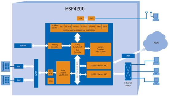 PMC-Sierra VoIP WiFi寬帶路由器方案的核心是MSP4200(見圖),MSP4200支持一個(gè)基于DSP的語(yǔ)音引擎,使得該MIPS處理器在管理、信令和高速IP路由任務(wù)中可發(fā)揮出最佳性能。這種架構(gòu)確保了相當(dāng)于固定線路快速以太網(wǎng)路由速度以及防火墻性能,并能同時(shí)在四個(gè)通道提供VoIP服務(wù)。另外它還有一個(gè)PCI接口以提供更多靈活性,支持各種802.11