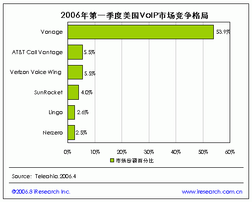 iResearch艾瑞市場咨詢根據(jù)美國融合通信和移動(dòng)通信行業(yè)市場調(diào)查公司Telephia統(tǒng)計(jì)數(shù)據(jù)顯示,在純VoIP服務(wù)市場上,Vonage公司擁有53.9%的市場份額,在市場份額排名上仍位居第一。并列第二位的有兩個(gè)公司,為Verizon Voice Wing公司和AT&T Call Vantage公司,市場份額均為5.5%,隨后的是SunRocket市場份額4%,Lingo2.6%,和NetZero Voice2.5%。