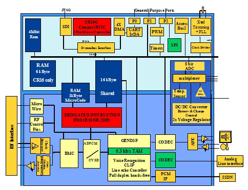 例如,SC14438是一個優(yōu)化了的CMOS芯片,能夠進行DECT(1.9GHz)內(nèi)或2.4GHz ISM數(shù)字頻帶手機內(nèi)需要的所有音頻、信號及數(shù)據(jù)處理。一個ADPCM代碼轉(zhuǎn)換器,一個低功耗的編解碼器(CODEC)及模擬前端被集成于該芯片中,提供麥克風與(動態(tài)的)揚聲器之間直接的連接。同時還整合了雙工免提操作。SC14438的設計適用于任一無線產(chǎn)品設計。一個專用的TDMA控制器能夠處理所有的物理層時隙和無線控制。美國國家半導體公司的標準小型RISC