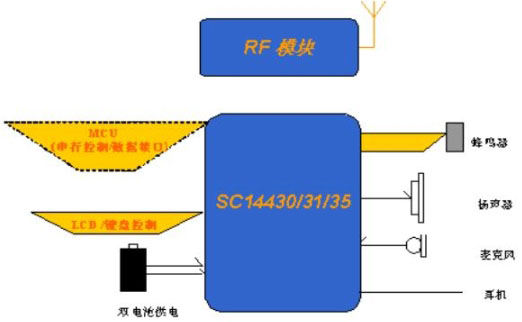 DECT的座機部分可以根據(jù)應用,選擇配置采用獨立模式或外接MCU的模式工作,方便用戶靈活擴展功能。外接MCU通過RS232口或SPI口與基帶處理器SC14438/37/35連接,實現(xiàn)控制/數(shù)據(jù)的交互。