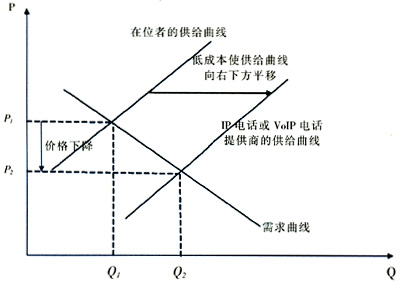 與傳統(tǒng)以電路交換為主的電話網(wǎng)相比,分組交換技術(shù)使得提供IP電話或VoIP電話所需的交換設(shè)備數(shù)量大大減少,而且部分提供IP電話或VoIP電話的運(yùn)營(yíng)商并沒有鋪設(shè)上下行用戶端的“最后一公里”線路。由于沒有全程布網(wǎng),在網(wǎng)間結(jié)算費(fèi)較低甚至不結(jié)算的情況下,其運(yùn)營(yíng)成本自然遠(yuǎn)低于本地運(yùn)營(yíng)商,從而使其供給曲線與本地運(yùn)營(yíng)商的供給曲線相比向右下方偏移,因而有能力推出價(jià)格遠(yuǎn)低于傳統(tǒng)語音的IP電話或VoIP電話,見圖2。