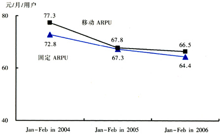 圖4 2004-2006年固定電話與移動(dòng)電話的ARPU對(duì)比