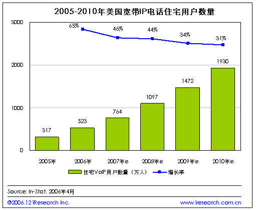 iResearch艾瑞市場(chǎng)咨詢(xún)根據(jù)In-Stat的調(diào)查數(shù)據(jù)整理發(fā)現(xiàn),2005年美國(guó)住宅VoIP用戶(hù)數(shù)量為317萬(wàn),到今年年底這一數(shù)字將達(dá)到523萬(wàn),比上年增長(zhǎng)65%.隨著寬帶互聯(lián)網(wǎng)接入的持續(xù)普及,據(jù)預(yù)測(cè)到2007年將有764萬(wàn)美國(guó)家庭使用寬帶接入的IP電話(huà)。