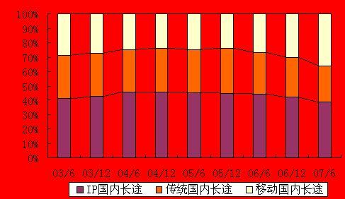 從圖中可以看出,IP電話的相對(duì)快速增長在一定程度上對(duì)傳統(tǒng)長途電話形成了替代作用,但近年來自于移動(dòng)長途的替代作用更明顯。從占比上來看,2007年上半年,IP國內(nèi)長途電話占全部國內(nèi)長途通話量38.3%,超過移動(dòng)長途電話的35.9%和傳統(tǒng)長途電話的25.8%,仍然是長途電話的主流。