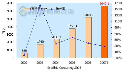 從圖中可以看出,中國的寬帶用戶數(shù)保持了快速的發(fā)展勢(shì)頭,從2002-2007年年均增長率為58.7%,至2007年,國內(nèi)的寬帶用戶數(shù)將達(dá)到6640.1萬。
