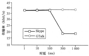ms時(shí)通話是可以接受的,時(shí)延為500 ms、1 000 ms時(shí)語音質(zhì)量就變得不可接受。對(duì)于Skype,時(shí)延對(duì)其服務(wù)質(zhì)量的影響更為明顯,如圖5所示,傳輸率從37.5