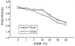 MOS方法評(píng)估了它們語音質(zhì)量的優(yōu)劣。通過實(shí)驗(yàn)可知:在理想的網(wǎng)絡(luò)狀況下,Skype表現(xiàn)得更好一些(兩者PESQ MOS的分?jǐn)?shù)差別為0.1),總體而言它們的語音質(zhì)量還是較為接近。在網(wǎng)絡(luò)有較長的時(shí)延時(shí),Skype有不必要的適應(yīng)性。當(dāng)丟包情況發(fā)生時(shí),GTalk沒有實(shí)施任何機(jī)制來提高其性能,與此同時(shí),Skype使用數(shù)據(jù)冗余機(jī)制來對(duì)抗丟包以提高其語音質(zhì)量。在抖動(dòng)情況發(fā)生時(shí),兩者都沒有很好的機(jī)制來提高其適應(yīng)性。當(dāng)有較長的時(shí)延時(shí),PESQ