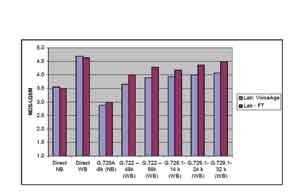 圖2對MOS(平均意見得分)值的分析深刻說明了寬帶是如何被主觀感知的。窄帶G.729A的多數(shù)MOS值約為 3.5,而高清語音的MOS值至少比其高出30%,達(dá)到4.5。