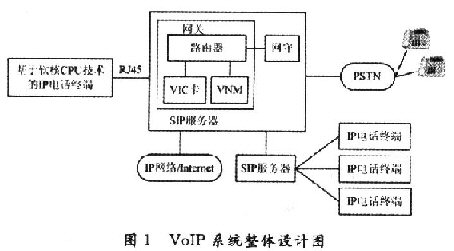 通過對國內外VoIP技術的研究,要面向社會推廣價格低廉的IP電話業(yè)務,普通用戶的電話終端成本,運營商的設備、管理成本都是必須考慮的因素。因此,設計出了一個VoIP系統方案,如圖1所示。