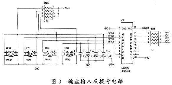為實現IP電話與普通電話的通用性,該終端加入鍵盤模塊,按鍵開關KEY0~KEY9,KEY_X,KEY_Y,KEY_ON,KEY_OFF(其中,除KEY_ON和KEY_OFF是鎖閉式按鍵外,其余均為非鎖閉式按鍵)采用行列掃描式接法,加入了74HC245總線收發(fā)器作為緩沖器,電路如圖3所示(由于按鍵過多,圖中僅給出KEY0~KEY3電路)。