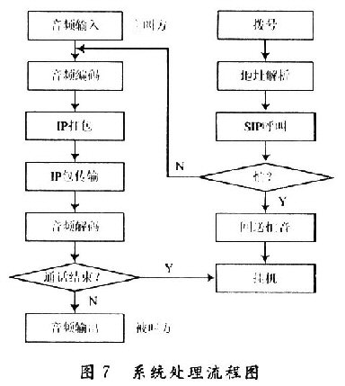 當撥號確認后,主控制器對編解碼器發(fā)送控制指令,開始語音A/D轉換,并進行編碼,送到片外存儲器內進行緩存;Nios CPU對撥號信息的解析確定。目的地址,通過Avalon總線對以太網接口發(fā)送數據傳輸指令;將符合以太網標準的數據從片外存儲器內讀出,送入Internet中,返回確認信息。系統處理流程圖如圖7所示。