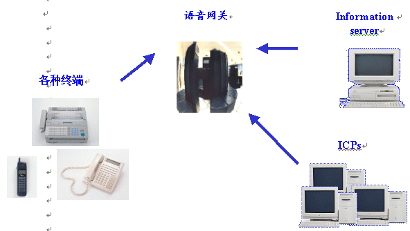 在這樣的體系結構中,各種終端通過PSTN網(wǎng)絡聯(lián)接到語音網(wǎng)關,而通過語音網(wǎng)關來訪問后臺的數(shù)據(jù)服務、應用服務,或者通過互聯(lián)網(wǎng)絡訪問各個語音ICP。