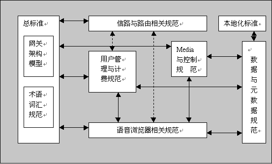 通過分析國際上各種語音網(wǎng)關系統(tǒng)極其技術規(guī)范,特別是參照 W3C組織的"Voice Browser" Activity的框架,我們認為作為一個比較完整的語音網(wǎng)關標準體系,應該包含以下具體標準規(guī)范的制定,通常稱之為標準需求。下圖顯示所需的規(guī)范類型及其相互關聯(lián)。