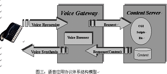 語音應用協(xié)議(VAP VA)定義了終端--?網(wǎng)關--?服務器的體系結構。語音服務器(Voice Server )是語音應用的服務器,其包含語音應用和數(shù)據(jù)、內(nèi)容;與WAP體系結構不同的是,語音網(wǎng)關(Voice Gateway) 做為終端和語音應用服務器的橋梁,作為語音應用協(xié)議中的重要部分:語音瀏覽器(Voice Browser)建于語音網(wǎng)關(Voice Gateway)內(nèi),而不象WAP協(xié)議中,micro browser 建于終端中。這是因為語音終端過于簡單以及語音數(shù)據(jù)可以通過電信網(wǎng)絡輕松與語音網(wǎng)關(Voice Gateway)交互。
