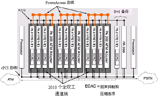 為了解決CompactPCI的這一限制,NMS開發(fā)出了PowerAccess體系結(jié)構(gòu),它借助現(xiàn)有的CompactPCI標(biāo)準,同時把它的通道容量擴展到2048之上。這種體系結(jié)構(gòu)以PowerAccess總線為特色,PowerAccess總線是一個輔助的4096個TDM時隙,支持現(xiàn)存的CompactPCI H.110總線。由于提供語音通道的增多,從而可以提高系統(tǒng)的密度。