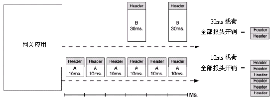 在一個減少發(fā)話方和受話方間音頻反應時間的努力中,VoIP網關通常會配置成發(fā)送較小的語音數(shù)據(jù)載荷。雖然這樣做通?梢詼p少聽得見的傳輸延遲,但同時也增加了一個給定語音數(shù)據(jù)流需要傳遞的包的數(shù)量。因為不管多小的音頻載荷都需要一個固定大小的包報頭,網上需要傳遞的數(shù)據(jù)量越大這個效果越明顯──跟隨的是網絡包和數(shù)據(jù)流量的相應增長。圖1說明了用于傳輸包報頭的帶寬會隨著包載荷大小的縮小而增大。