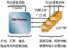 這種新型半導(dǎo)體元件被叫作語(yǔ)音處理器(VP),它不是技術(shù)創(chuàng)新成果,而只是傳統(tǒng)DSP核心和通用RISC處理器在一個(gè)或兩個(gè)硅片上的重新包裝和集成。DSP核心完成VoP的壓縮、回聲抑制和各種信號(hào)處理任務(wù),而RISC處理器完成VoP的匯聚和打包處理。