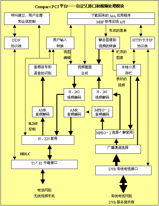 總線。T1/E1中繼和有線電視的接口模塊可以合并,包括其中必須的視頻和音頻處理。但是,用于Compact PCI系統(tǒng)的、新的、高帶寬的交換結構使得把這些功能分離成不同的模塊成為可能,免除媒體通過PCI總線的必要。