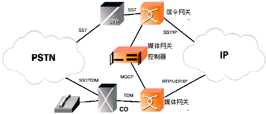 IP電話技術(shù)把話音、傳真數(shù)據(jù)和IP網(wǎng)絡(luò)無(wú)縫地集合到了一起。因特網(wǎng)工程任務(wù)組(IETF)已經(jīng)建議了一個(gè)功能模型,來(lái)橋接包交換的IP網(wǎng)和電路交換的PSTN,這些橋接設(shè)備就是:信令網(wǎng)關(guān)(SG)、媒體網(wǎng)關(guān)(MG)、和媒體網(wǎng)關(guān)控制器(MGC)。(請(qǐng)參看圖1)。MGC通常又被叫做軟交換,正如它的名字表達(dá)的意思一樣,MGC控制著媒體從電路交換領(lǐng)域經(jīng)過(guò)媒體網(wǎng)關(guān)的網(wǎng)絡(luò)傳送到基于包的領(lǐng)域。呼叫控制消息首先送達(dá)SS7信令網(wǎng)關(guān),轉(zhuǎn)換成網(wǎng)關(guān)網(wǎng)絡(luò)中的MGCP(媒體網(wǎng)關(guān)控制協(xié)議)來(lái)控制媒體流,完成呼叫的控制、接續(xù)。話音、傳真和圖象介質(zhì)都是從PSTN交換網(wǎng)通過(guò)這些新一代的媒體網(wǎng)關(guān)連接到IP網(wǎng)的。