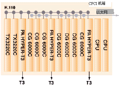 HYPER-T3接入適配板,它用于通過(guò)T3線上的1344個(gè)端口從PSTN接入語(yǔ)音和傳真媒體。這些媒體會(huì)從DS3轉(zhuǎn)換到DS0,然后通過(guò)H.110總線發(fā)送給6塊CG6000C中的一塊。CG6000C會(huì)壓縮這些語(yǔ)音和傳真媒體,然后用UDP/IP上實(shí)時(shí)協(xié)議(RTP)對(duì)它們進(jìn)行打包。再通過(guò)板上的兩個(gè)以太網(wǎng)接口發(fā)送到一個(gè)語(yǔ)音級(jí)的IP包網(wǎng)絡(luò)上。請(qǐng)注意,每種板都使用了N+1板卡級(jí)的冗余備份。
