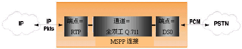 MSPP通道可以是全雙工語(yǔ)音編碼器、傳真轉(zhuǎn)發(fā)編碼器、或者是各種單工通道。在一個(gè)普通VoIP網(wǎng)關(guān)應(yīng)用中,一個(gè)端點(diǎn)就是一個(gè)和PSTN連接的DS0,PSTN連接最常見(jiàn)的是CG6000系列平臺(tái)上的T1或E1接口,也可能是T3接口。其它連接是一個(gè)通過(guò)以太網(wǎng)接口連接到廣域包網(wǎng)絡(luò)(WAN)的RTP話音包端口。通過(guò)指定端點(diǎn)和通道類(lèi)型,很容易開(kāi)發(fā)出各種包電話應(yīng)用。