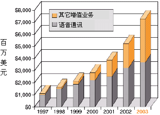 為了獲得競爭優(yōu)勢,業(yè)務(wù)提供商──傳統(tǒng)長途運(yùn)營和本地交換運(yùn)營商,因特網(wǎng)業(yè)務(wù)提供商(ISP),應(yīng)用業(yè)務(wù)提供商,以及無線運(yùn)營商──都在想方設(shè)法發(fā)布基于IP的業(yè)務(wù),這些業(yè)務(wù)應(yīng)該:對用戶有較高的價值,能縮短面市所需時間,部署是低成本高效益的。向用戶提供高價值的增值業(yè)務(wù)能為業(yè)務(wù)提供商帶來重要的收入源泉,并使他們更有特色,增加市場分額,特別是如果這些業(yè)務(wù)以快速、易于支持的方式部署,以上這些優(yōu)勢就會更加突出。據(jù)估計,到2003年增值業(yè)務(wù)設(shè)備僅在美國就能達(dá)到73億美元的市場,正如圖1所示。